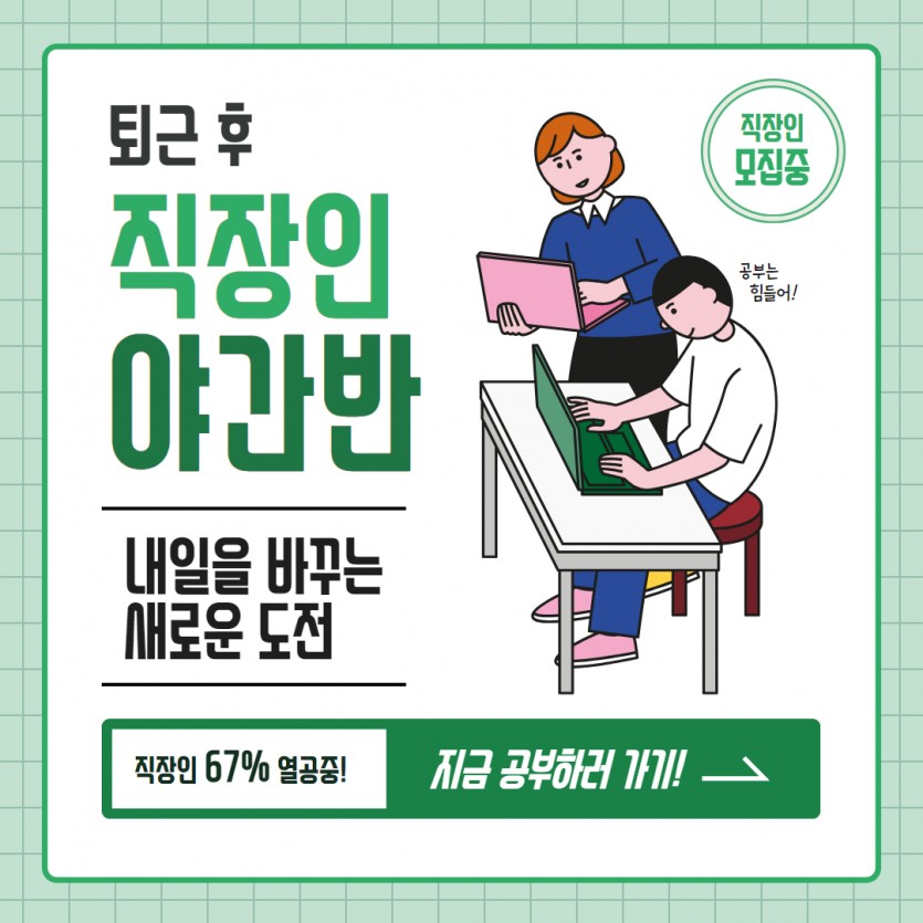 저희 학원에서는 직장인을 위해 퇴근 후 수강할 수 있도록 야간반을 운영하고 있습니다.